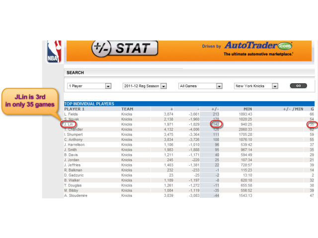 Really? Was Jeremy Lin the Most Impactful Player for NY Knicks during 2011-2012 Regular Season when he played for 35 games and not sidelined with injury? Yes, but it's not my opinion. NBA.com +/- Stat says so.